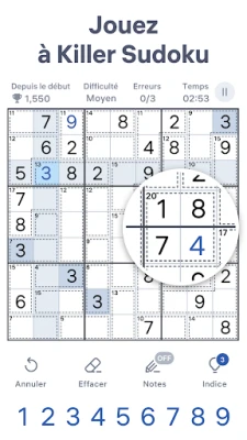 Qu'est-ce qui rend Killer Sudoku si captivant ? Imaginez la grille emblématique de Sudoku, où chaque ligne, colonne et bloc 3x3 doit contenir les chiffres de 1 à 9 sans répétition. Ajoutez-y des "cages" – des zones délimitées par des pointillés – chacune arborant une somme cible dans son coin supérieur. Votre mission est de remplir ces cages de manière à ce que leurs chiffres s'additionnent précisément à cette cible, tout en respectant l'interdiction de doublons au sein de la cage. Ce défi ingénieux, parfois connu sous les noms de Sumdoku ou Addoku, exige une logique affûtée et une vision stratégique pour maîtriser chaque tableau, sachant que la somme totale d'une ligne, colonne ou bloc est toujours de 45.